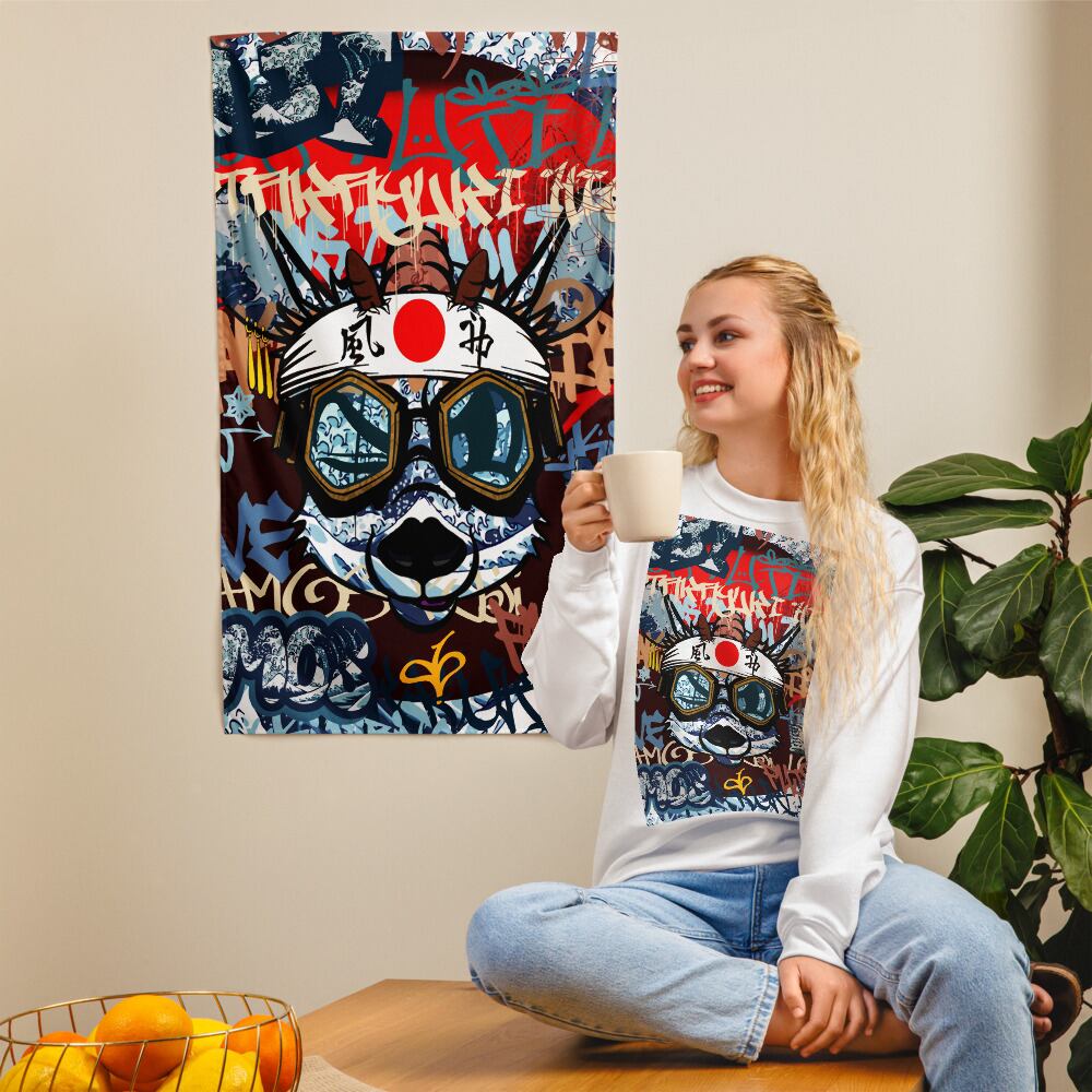 この象徴的なオリジナルのアートワークは若いかもしかの侍をメインに富岳三十六景の浮世絵を再構築したグラフィティアート。日本固有の絶滅危惧種ニホンカモシカ「KAMOS」をストリートアート風に描いた作品。KAMOSの特徴は人間に襲われた右目にあり、口元の歪んだ表情には何かを感じさせるものがある。 反抗的な言論の感覚を呼び起こす微妙な皮肉を込めて、KAMOS の物語が展開し、絶滅の危機に瀕した世界でニホンカモシカが直面する象徴的な挑戦を示しています。 挑発的で考えさせられる物語を伝えながら、このユニークな生き物の回復力を表現します。